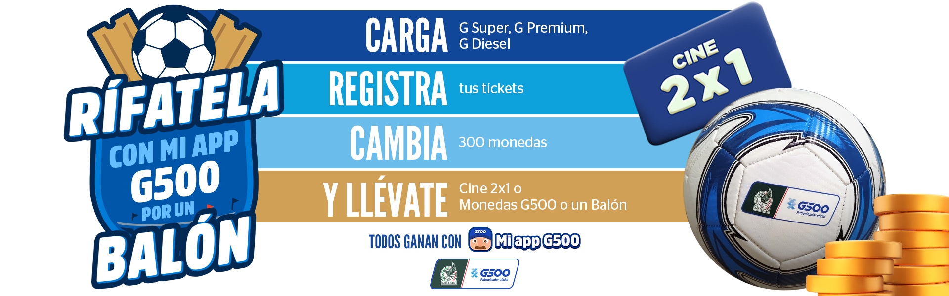 ¡Rífatela con Mi App G500 por un Balón! Participa con solo 300 Monedas G500 y gana uno de estos 3 premios, un bono de 20 Monedas G500, un pase 2×1 para el cine o el Balón G500. ¡Todas las participaciones tienen premio!